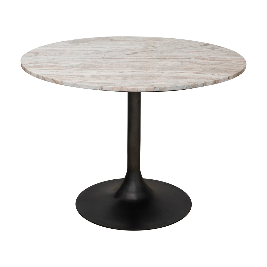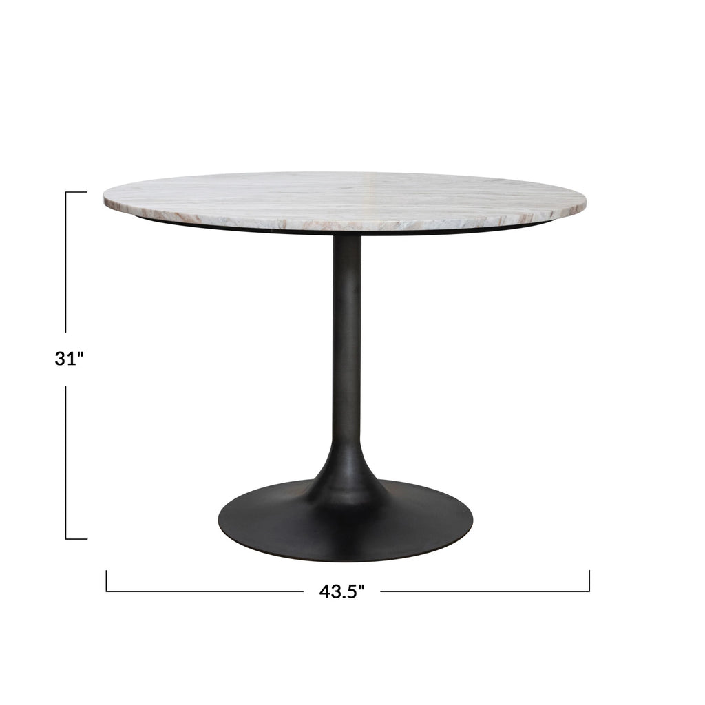 Elevate your space with this stunning marble top pedestal table! Featuring a beautifully veined round marble surface of charcoal and beige colors, each table showcases natural variations that make it truly one of a kind. The smooth stone top is paired with a sleek, matte black metal pedestal base, creating a timeless blend of modern elegance and classic design.