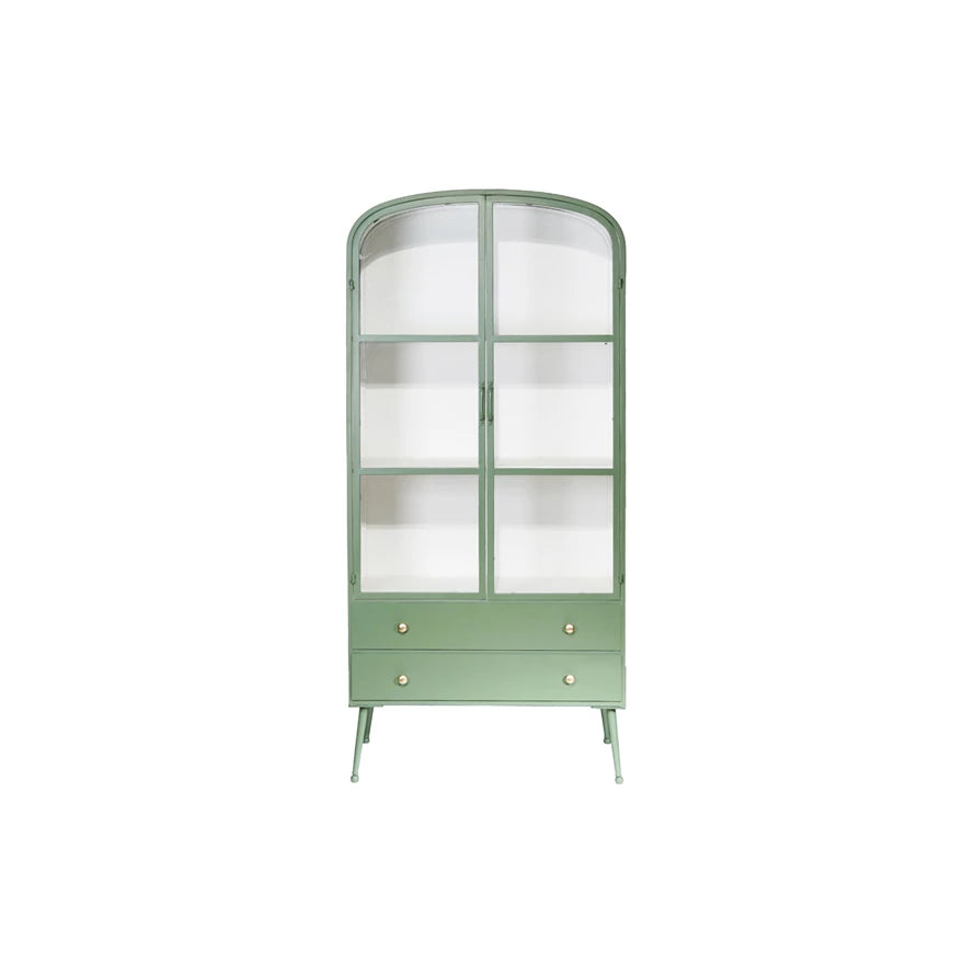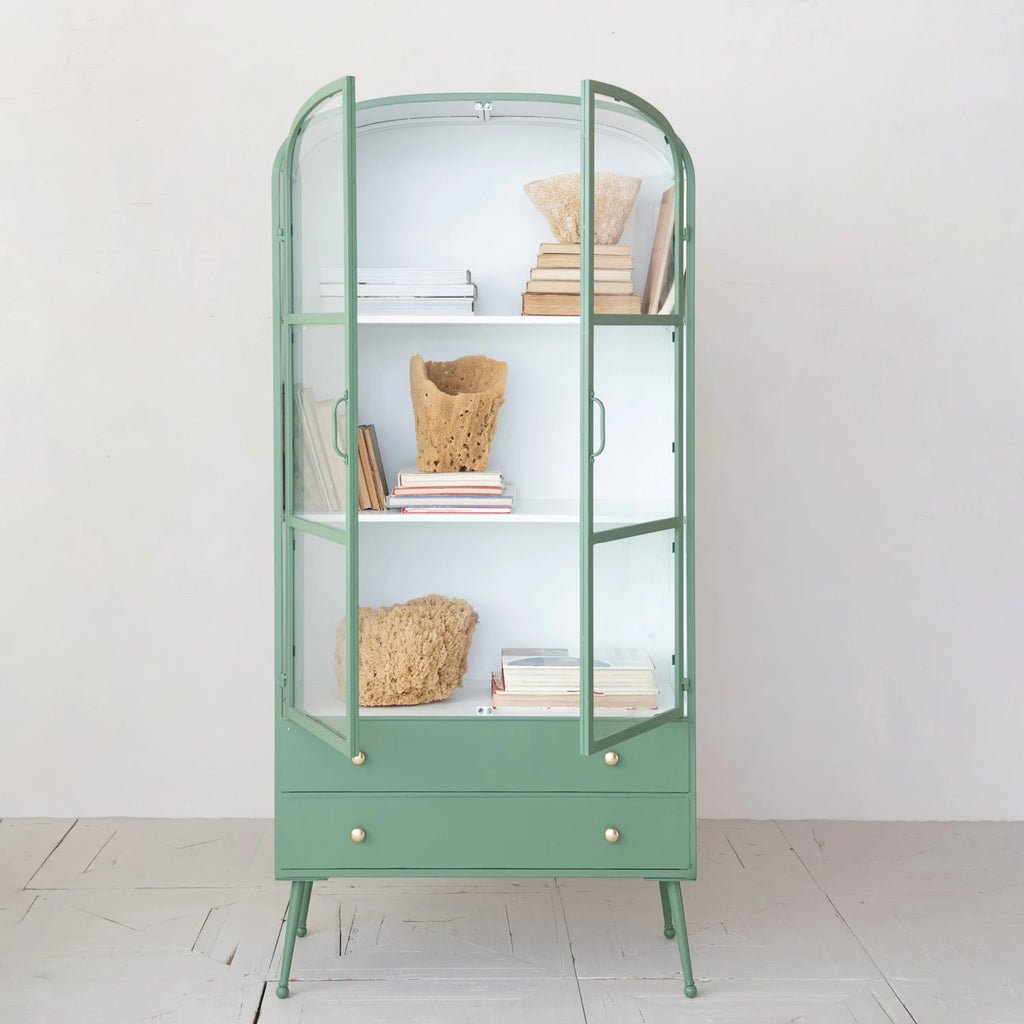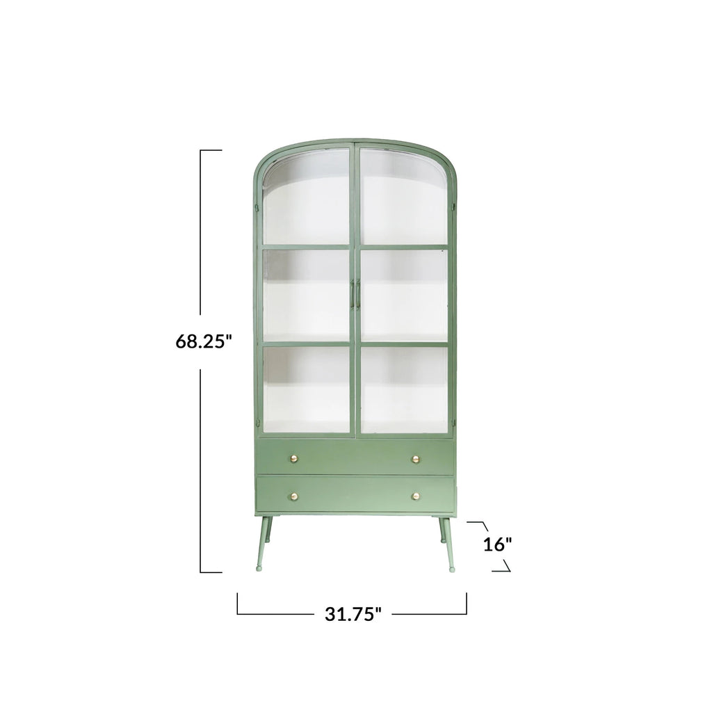 Transcend time with this amazing retro style metal cabinet featuring a clean, elegant silhouette with a softly arched top and glass-paneled double doors. The muted sage-green finish gives it a calm, modern feel, while the metal frame adds durability and a subtle industrial touch. The white interior shelves make it ideal for displaying books, décor, or tableware. Two lower drawers with small gold knobs provide concealed storage, and slender tapered legs lift the cabinet slightly off the floor for a light, mid-century–inspired look. Both functional and decorative, this cabinet works well in living rooms, dining spaces, or home offices.