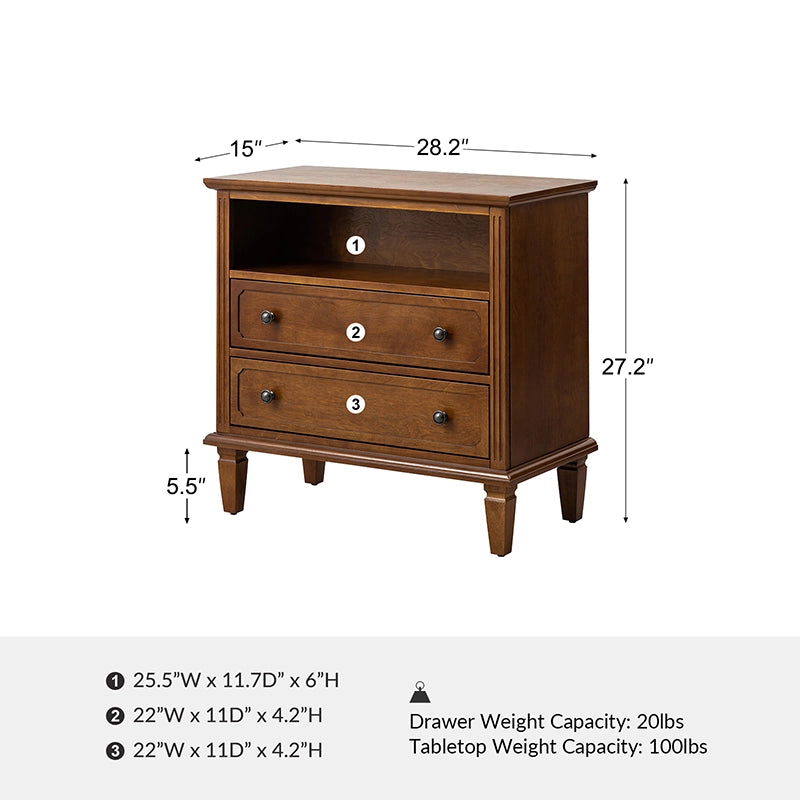 This nightstand creates a more welcoming and elegant living space. With solid legs and manufactured wood frame, this nightstand is sturdy and durable for long-term use. It has two drawers of storage space, spacious enough to help you organize your room and meet different storage needs. You can place frequently used items on the tabletop, such as alarm clocks, cell phones, magazines, etc., allowing you to easily reach for items at any time. The back of the nightstand comes with an outlet and space to hide wires, so you can easily plug in wires to connect to power. This nightstand blends seamlessly into your bedroom, living room, study, or even office. It adds harmony to your interior style.