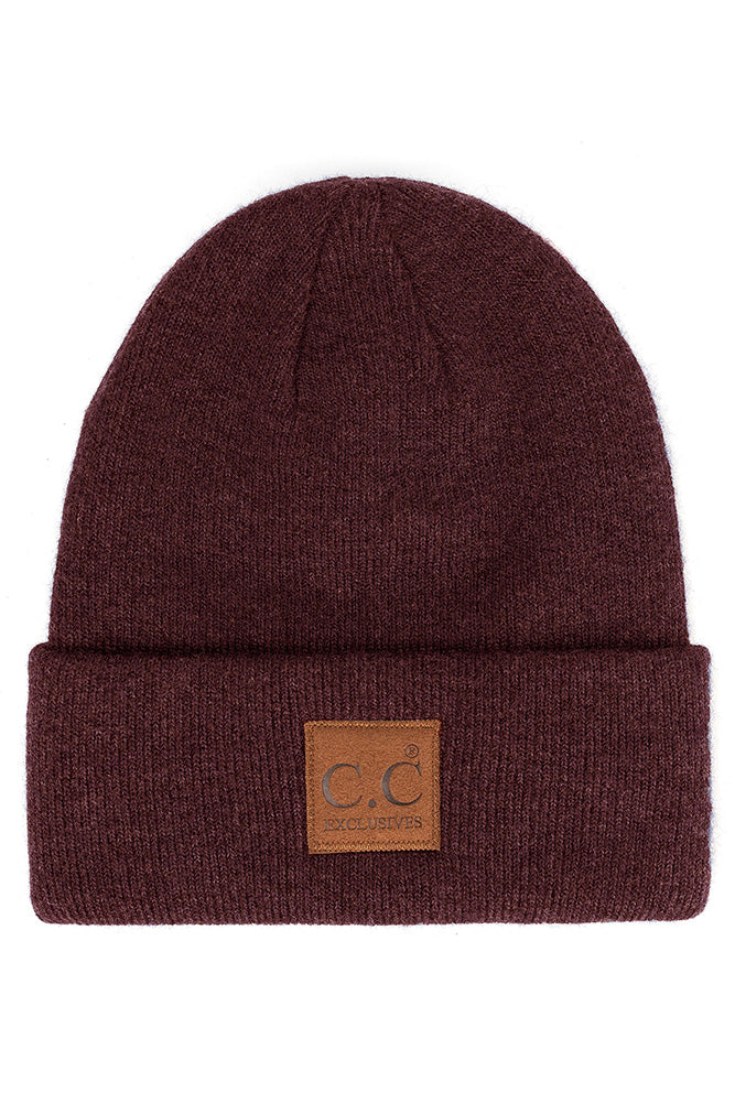 Heather knit beanie hat with C.C suede patch