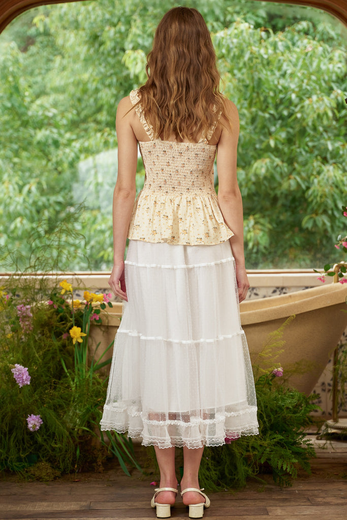 A sweet yellow peplum top featuring floral prints, ruched ruffle straps, and a soft flounce hem.