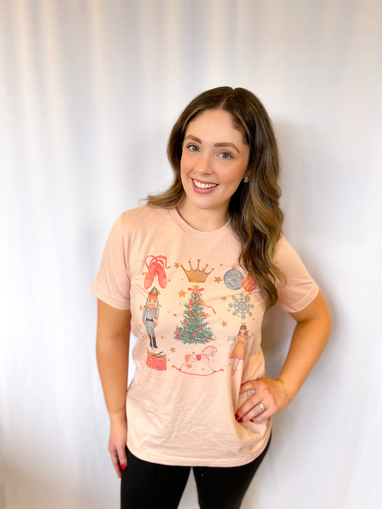 This nutcracker Christmas collage coquette tee is the perfect addition to your holiday wardrobe. The soft and cozy material of this tee will keep you comfortable all day long, whether you're at a holiday party or curled up on the couch watching your favorite Christmas movie.